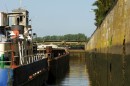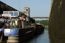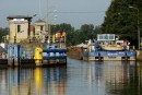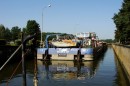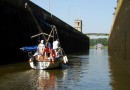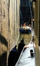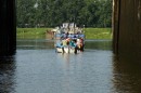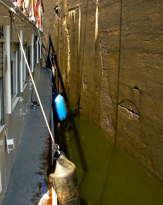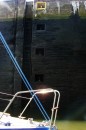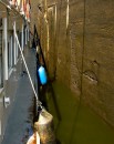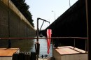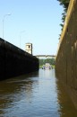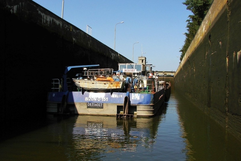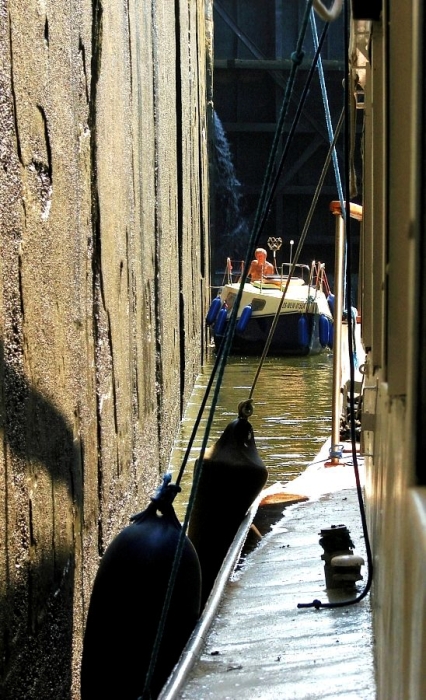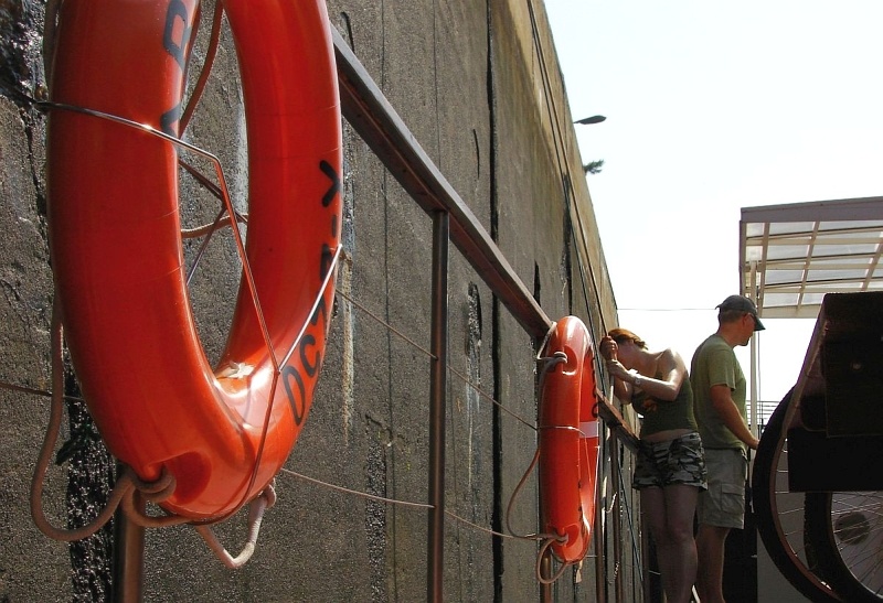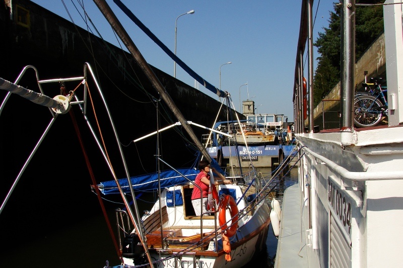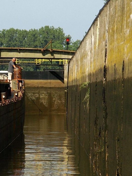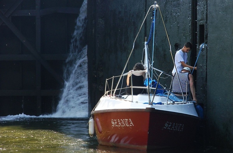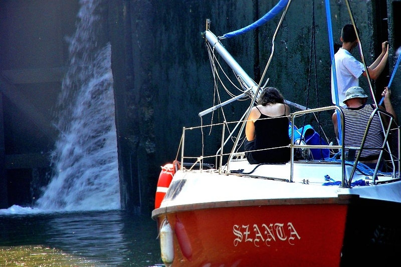 Stalowe, dwuskrzydłowe wrota zamykają komorę śluzy. Mamy prawie 40 minut na przyjrzenie się z bliska wnętrzu komory, sąsiednim jednostkom pływającym, coraz wyższym ścianom, na których pojawiają się zielone roślinki, cudem żyjące raz na powierzchni, raz pod wodą.
