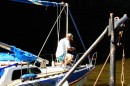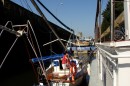 Przywiązanie cumy na sztywno, przez gapowatą załogę, może skończyć się zawiśnięciem jachtu na ścianie.