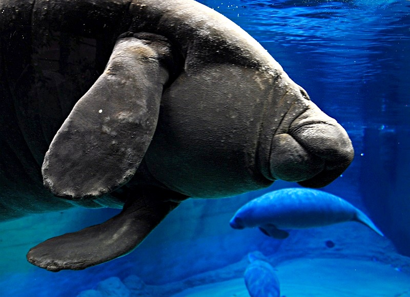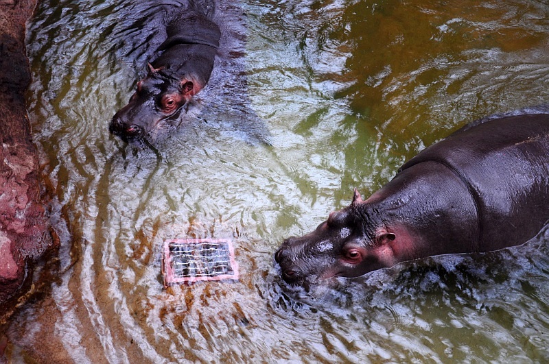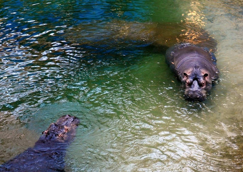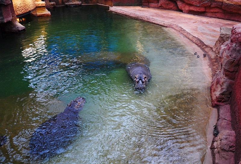 Nie śmigające szybciej od migawki rekinki, nie przyklejone do szyb aligatory, ale właśnie hipopotamy na dłużej przyciągnęły uwagę. Trzy hipopotamy w jednym zbiorniku potrafiły nieźle zamącić wodę i zdjęcia z poziomu wody nie są szczególnie wyraźne, ale to właśnie dla hipopotamów warto odwiedzić Afrykarium we wrocławskim ZOO.