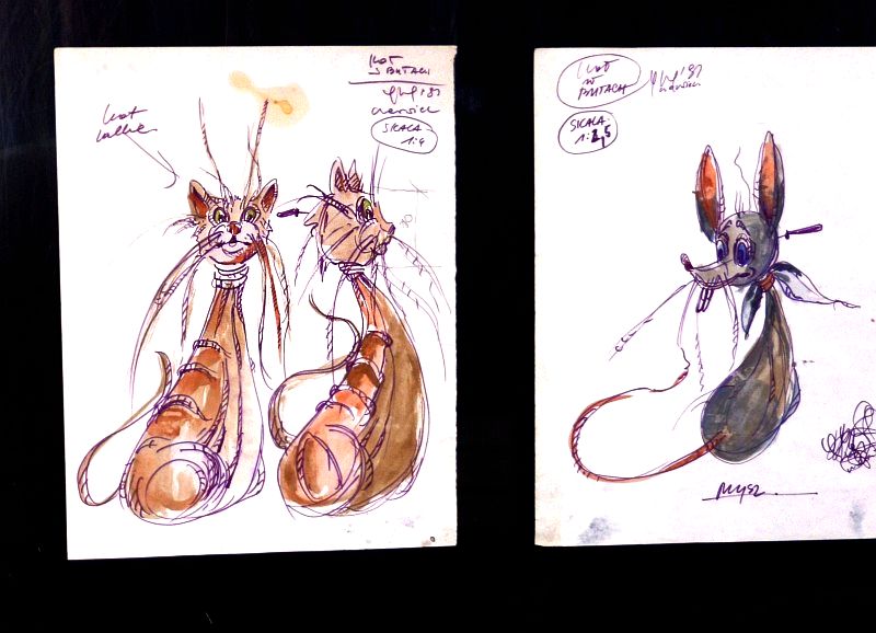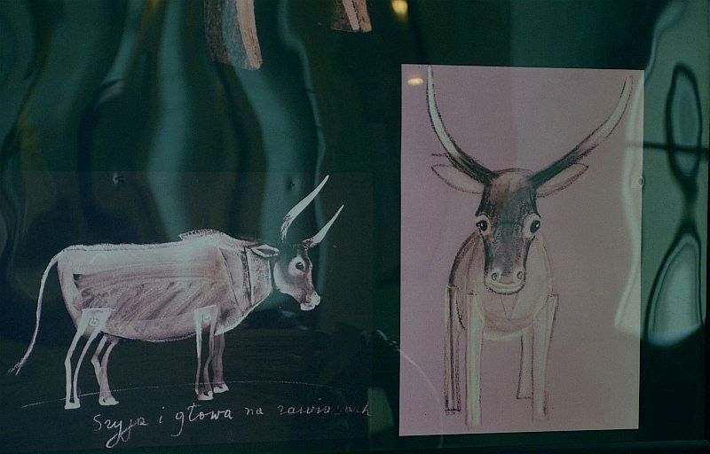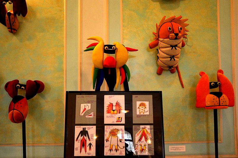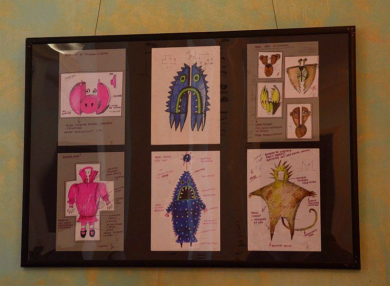 Na ścianach, powyżej lalek, umieszczono szkice projektów. Dla małych dzieci, które licznie przybyły na otwarcie wystawy może na czytanie za wcześnie, ale starszym widzom szczególnie polecam lekturę tych rysunków i opisów. Patrząc na szkic i ostateczne dzieło, czytając zamysł projektanta i uzyskany efekt nie mogłam oprzeć się wrażeniu, że mamy do czynienia z magią. Że za dotknięciem czarodziejskiej różdżki dwuwymiarowe postaci spłynęły z kartek papieru i wmieszały się w grupy zwiedzających dzieci.