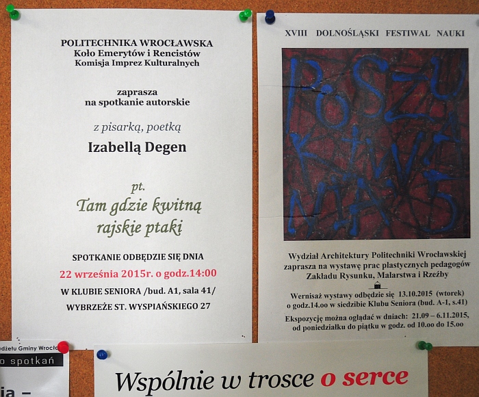 Komisja Imprez Kulturalnych Koła Emerytów i Rencistów Politechniki Wrocławskiej zaplanowała z wyprzedzeniem spotkanie autorskie z Izabellą Degen, w ramach cyklicznych spotkań w Saloniku Literackim. W harmonogramie spotkań wpisano: 22 IX (wt) Izabella Degen Tam gdzie rosną rajskie ptaki – promocja książki.