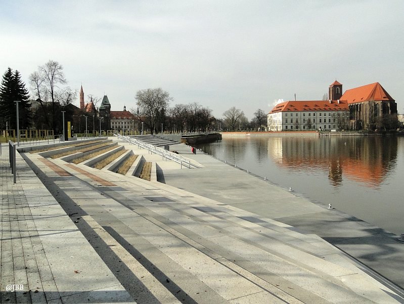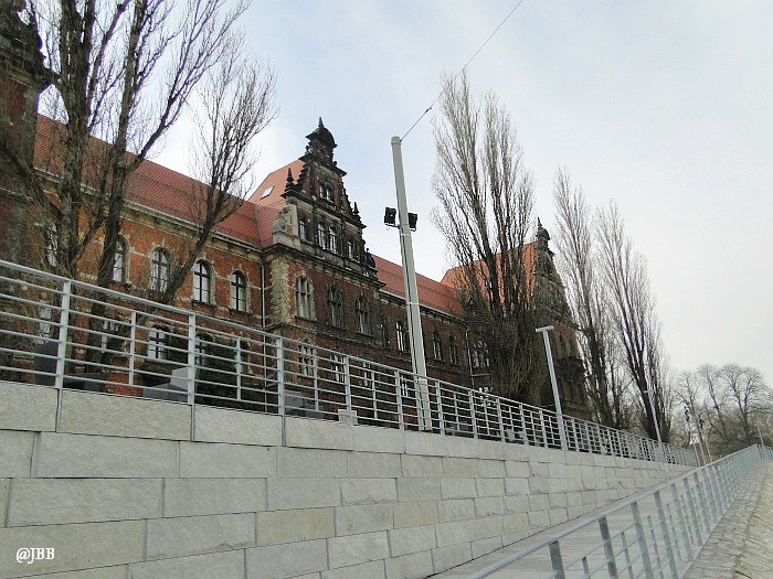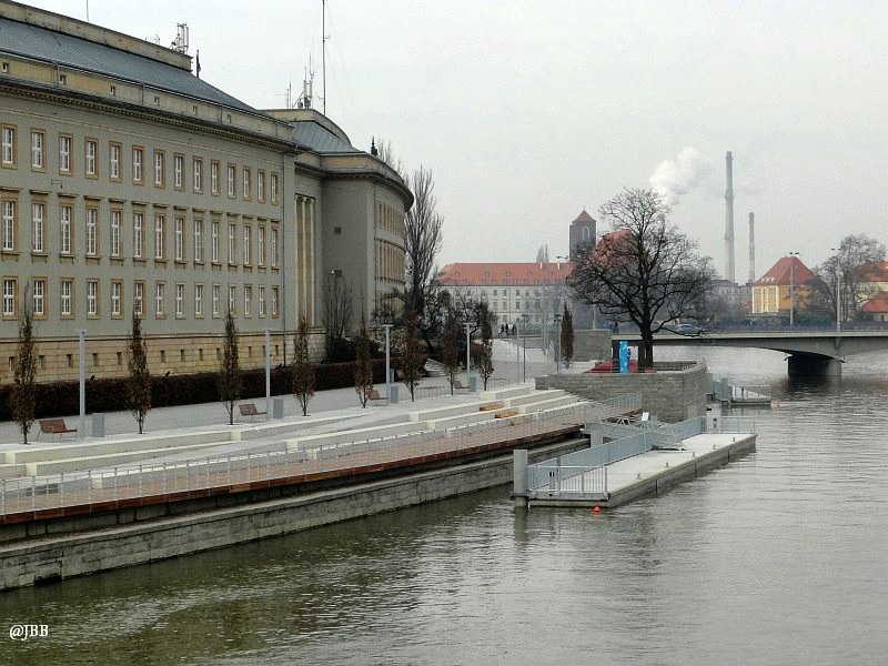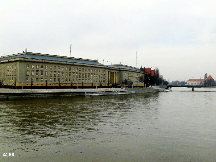 Wzdłuż lewego brzegu Odry jest wizualnie trochę spokojniej. Monumentalny gmach Urzędu Wojewódzkiego, zaprojektowany dla potrzeb niemieckich władz miejskich przez Feliksa Bräulera (w nawiązaniu do konkursowego projektu Alexandra Müllera i Ferdinanda Schmidta z roku 1927) zajmuje praktycznie całą działkę wzdłuż bulwaru – od mostu Grunwaldzkiego, do mostu Pokoju.