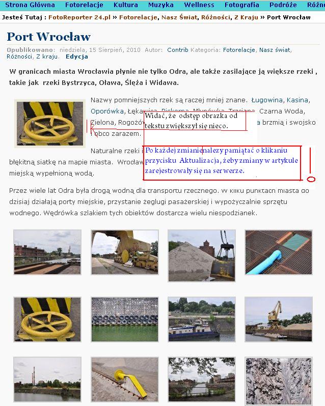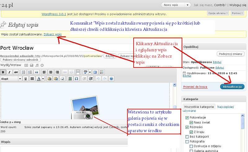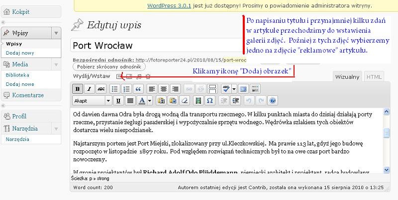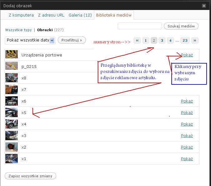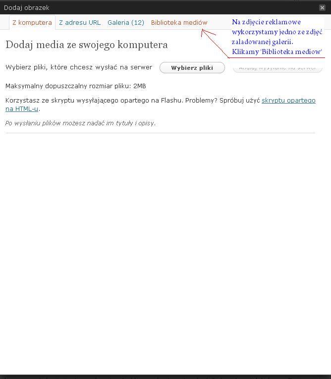 Poniżej instrukcja dodawania galerii, złożona z kopii kolejnych ekranów, po których się poruszamy. Na każdym rysunku ekranu dopisane są krótkie informacje i strzałki, wskazujące na najważniejsze elementy i funkcje danego etapu dodawania galerii zdjęć do artykułu.