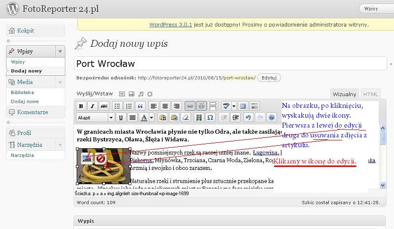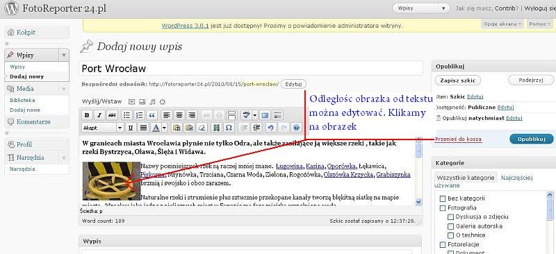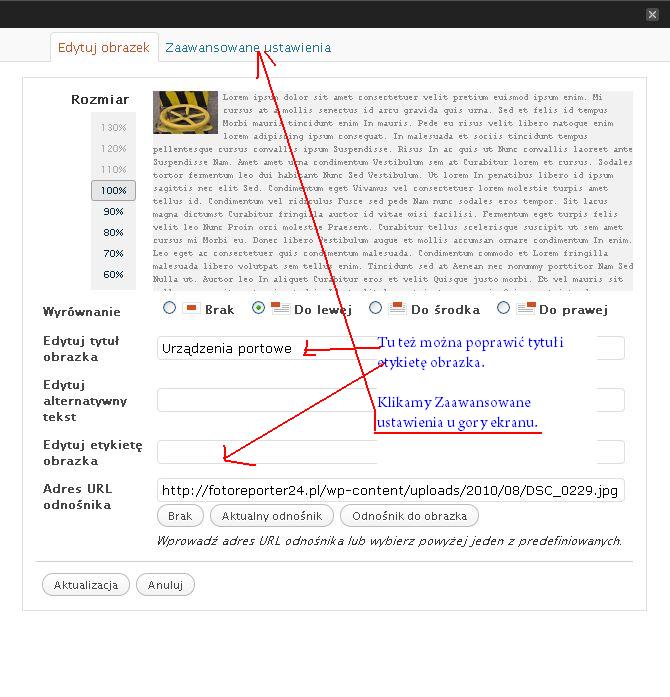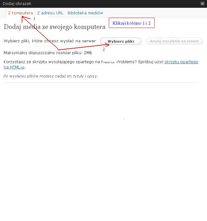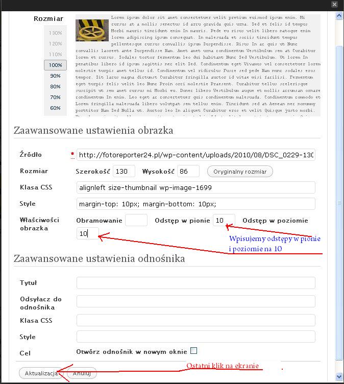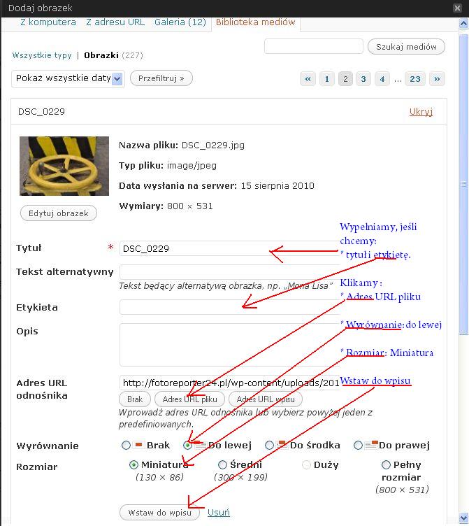 Do artykułu można dodawać zdjęcia na dwa sposoby: pojedynczo, kiedy klikamy ikonę Dodaj obrazek i przechodzimy przez etapy wyboru zdjęcia z komputera, opisu tytułu, etykiety, wyboru wielkości miniaturki i wyrównania, aż do ostatniego kliknięcia przycisku Wstaw do wpisu.