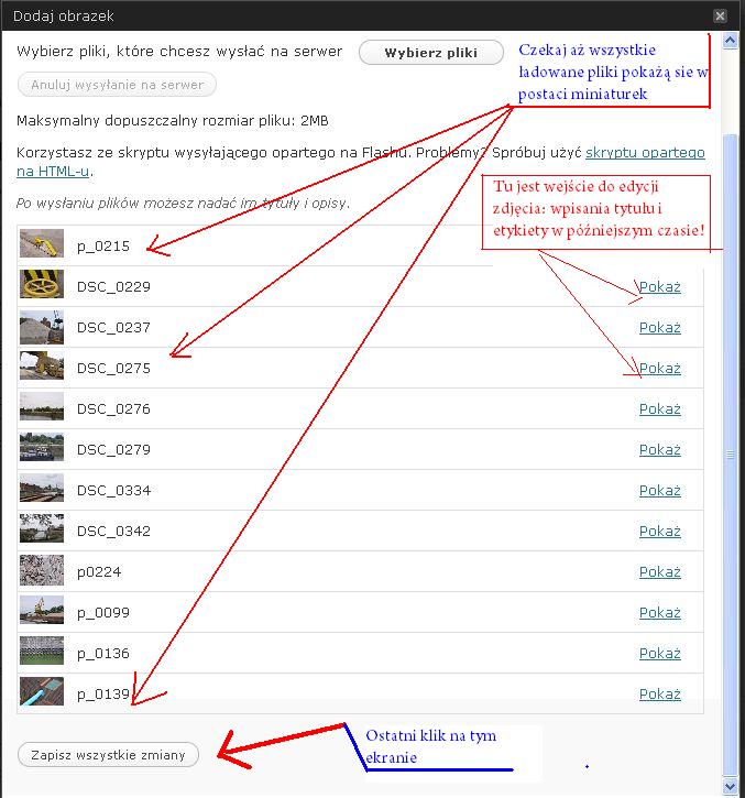 Na etapie hurtowego wstawiania zdjęć nie zajmujemy się wpisywaniem tytułów i etykiet. Można to zrobić później, edytując galerię lub bibliotekę mediów.