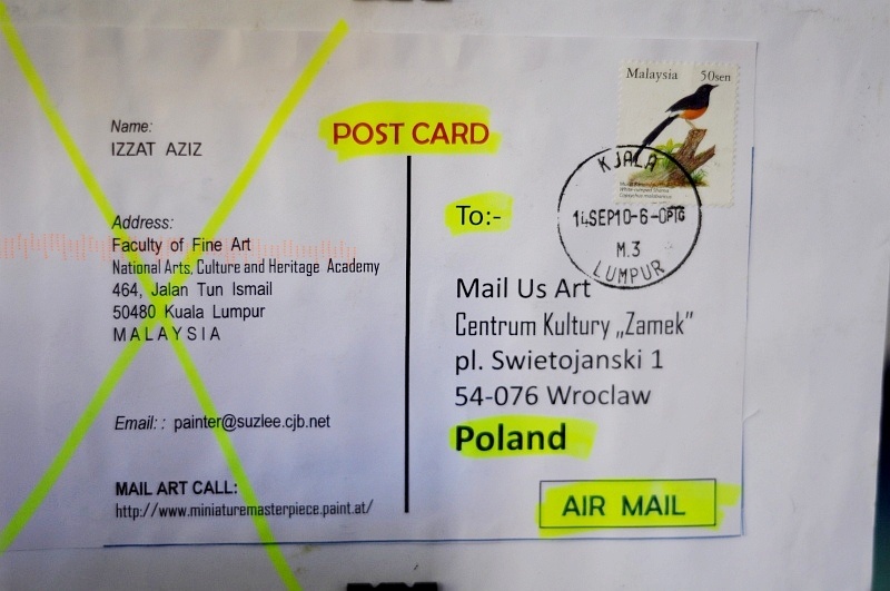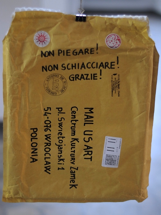 Na wystawę sztuki mailartowej, zorganizowanej przez Centrum Kultury Zamek we Wrocławiu, nadesłano prace z 24 krajów świata. Większość z nich wyeksponowano razem z kopertami, w których nadeszły. Dzięki temu można ze znaczków i pocztowych pieczęci odczytać kraj pochodzenia: Polska, Francja, Niemcy, Belgia, dalej Japonia, Urugwaj, Stany Zjednoczone, Rosja, Nigeria i inne.