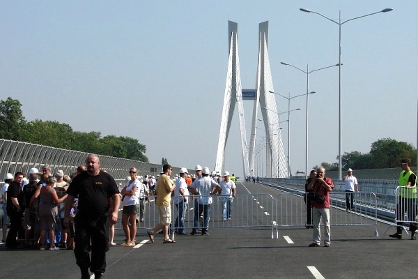 Niestety, wbrew zaproszeniu Gazety, nie było mi dane podejść bliżej, niż na odległość 12-to krotnego zoomu mojego Sony. Dzień Otwarty zorganizowano (firma Sport Media i Generalna Dyrekcja Dróg Krajowych i Autostrad) nie wiedzieć czemu, przed ostatecznym odbiorem i oddaniem obiektu do użytku. Tym faktem tłumaczono ograniczenia swobodnego dostępu. Spacer po moście był dawkowany. Kiedy grupa wybrańców ruszyła na zwiedzanie, pozostali czekali w tłumie i upale przed barierką. Po drugim pasie przejechali rowerzyści, których przybyło podobno z tysiąc.
