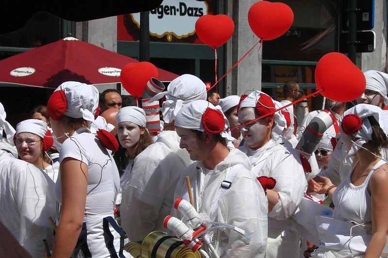Piękna katedra, kojarząca się z Notre Dame w Paryżu, wspaniałe detale, witraże, rzeźby… Manifestacja równie ciekawa – kolorowa i radosna. W głowę zachodzę, co przedstawiają te nadmuchane, wielkie poduchy…To zwierzak jakiś?