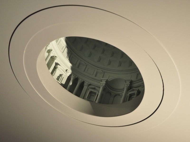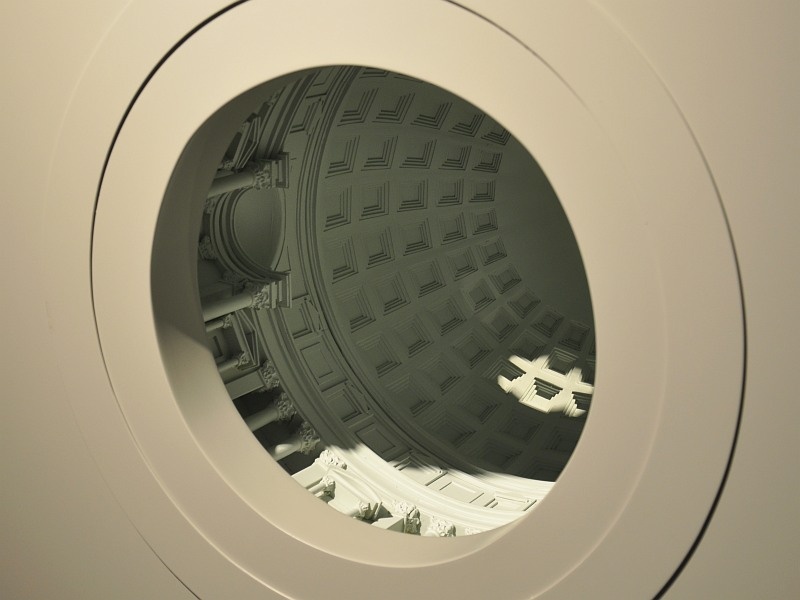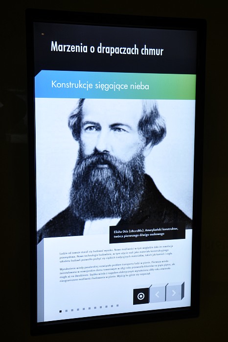W Pokoju Edukacyjno-Poznawczym poznamy inne ciekawe realizacje architektów z wyobraźnią. Precyzyjna makieta Pantheonu (118-125) wyeksponowana obok makiety Centennial Hall (1911-1913) to symbol ciągłości pewnych idei piękna w architekturze na przestrzeni wieków. Z podświetlonej gabloty patrzą na nas oczy marzyciela. To portret Elisha Otis’a (1811-1861), amerykańskiego konstruktora, twórcy pierwszego dźwigu osobowego. „Wynalezienie windy pasażerskiej” – czytamy pod zdjęciem – „rozwiązało problem transportu ludzi w pionie. […] Wyścig ku górze się rozpoczął”.