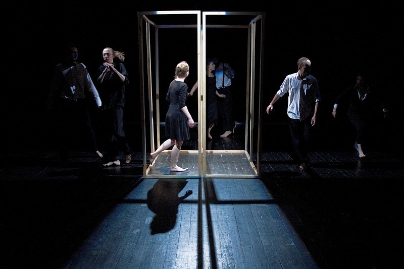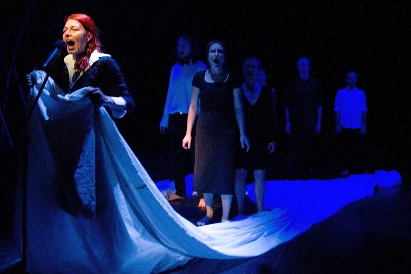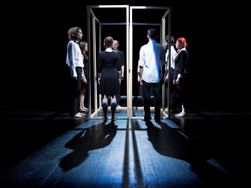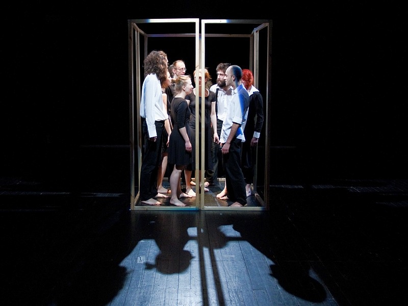Z wykorzystaniem prostych elementów: ośmiu drewnianych ram i pasa białego materiału, ośmiu artystów na oczach widzów tworzy wielorakie konstrukcje i symboliczne przestrzenie. Pojedyncze dźwięki, sylaby, słowa wypowiadane rytmicznie, chóralnie i indywidualnie, ciszej i głośniej tworzą specyficzną muzykę tego plastyczno-muzycznego wydarzenia teatralnego.
