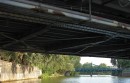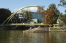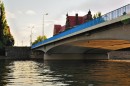 Przepływamy pod Mostem Pokoju. Na prawym brzegu Odry straszy niedokończone (tak przynajmniej wygląda) gmaszysko biblioteki uniwersyteckiej, którego prostopadłościenna, monolityczna bryła z wąskimi okienkami i płaskim dachem jest wizualnym zgrzytem i psuje każde panoramiczne zdjęcie.