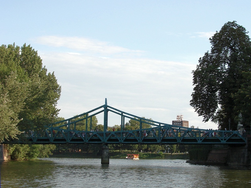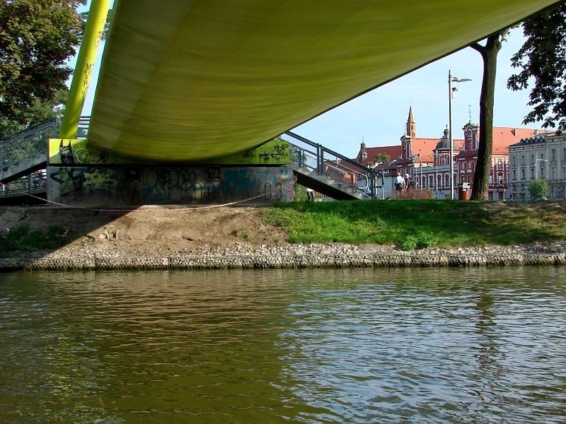 Przepływamy pod Mostem Pokoju. Na prawym brzegu Odry straszy niedokończone (tak przynajmniej wygląda) gmaszysko biblioteki uniwersyteckiej, którego prostopadłościenna, monolityczna bryła z wąskimi okienkami i płaskim dachem jest wizualnym zgrzytem i psuje każde panoramiczne zdjęcie.
