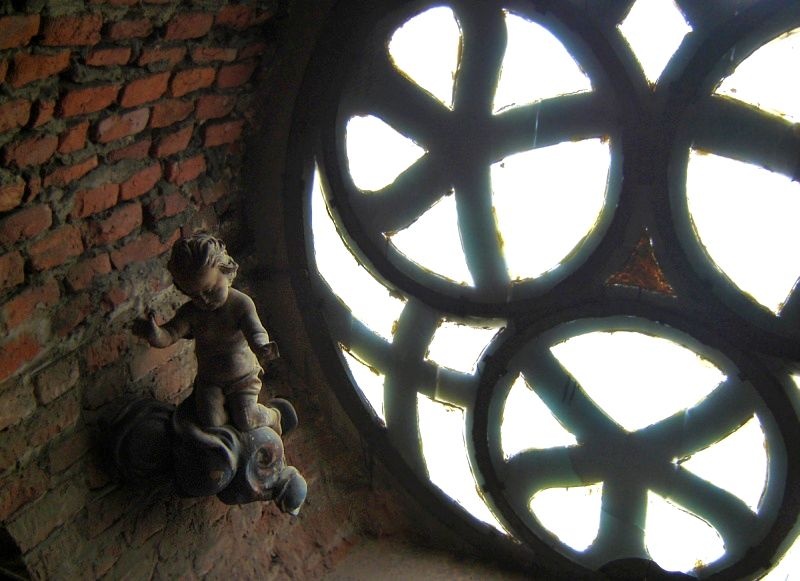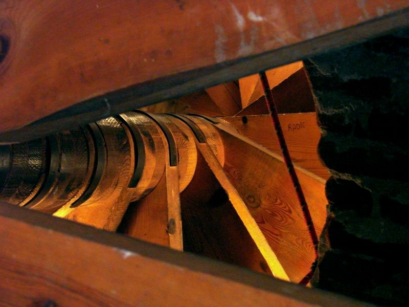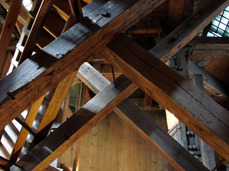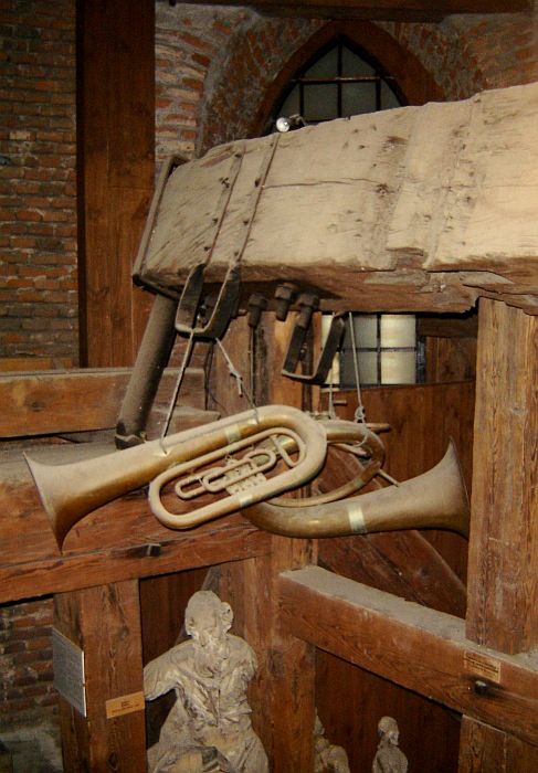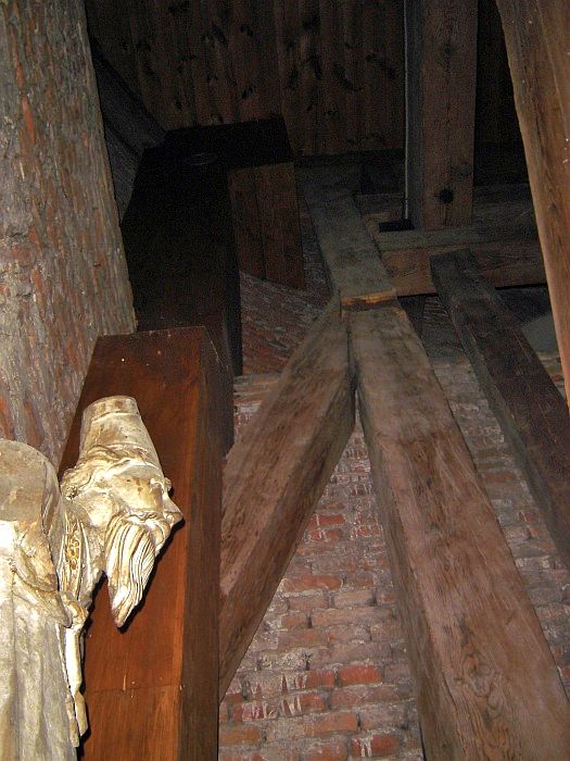 Pięć kondygnacji ceglanej wieży wypełniają drewniane konstrukcje, solidne belki, platformy i niesamowite schody. Dębowe, grube bale, pamiętające czasy jezuitów, wzbudzają zachwyt nie tylko swoją solidnością, ale niezwykłą prostotą konstrukcji. Sprawiają wrażenie wachlarza rozpiętego wokół pionowej belki – osi wieży. Z półmroku wyłaniają się figury „płaczek”, rzeźby Chrystusa Frasobliwego, Archanioł depczący szatana. Małe figurki zdają się być przebudzone światłem flesza.