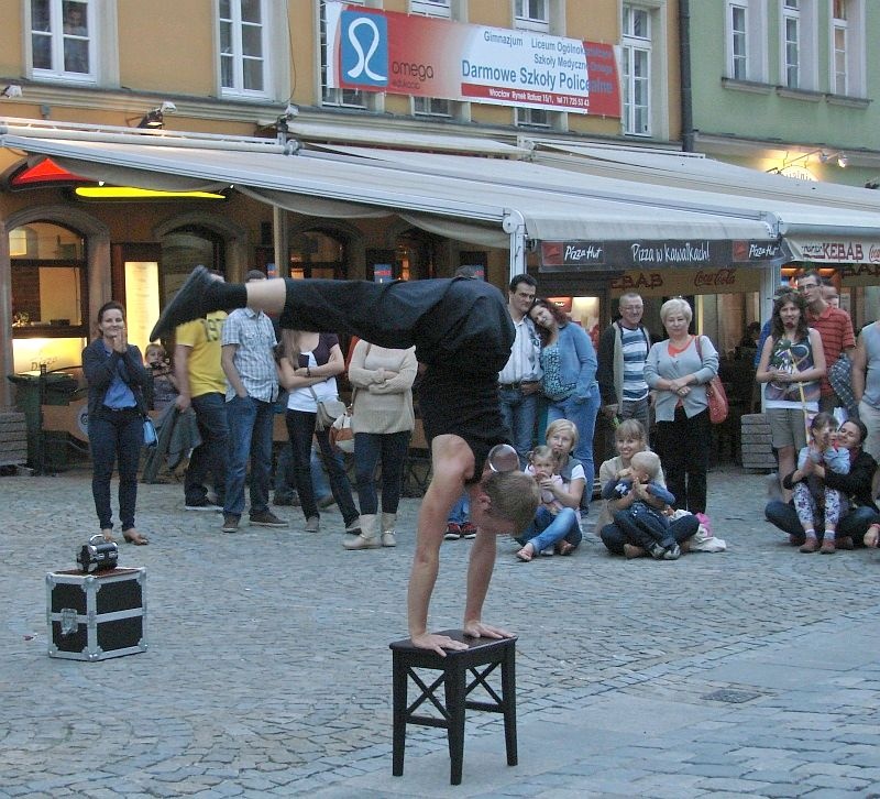 W mediach zabrakło informacji o programie, tematyczne linki internetowe (np. na www.wroclaw.pl) okazały się nieaktywne. Jedyna informacja – w dodatku „Co jest grane” GW – zapraszała do Rynku na godz. 19. Cudowna pora… zwłaszcza dla dzieci i fotografów. A i dla artystów raczej nieciekawa. Ich przedstawienia bazują na barwnych strojach, małych rekwizytach, które można spakować do podróżnego kuferka, gestykulacji i mimice. Brak światła dziennego chyba tylko połykaczom ognia sprzyja…