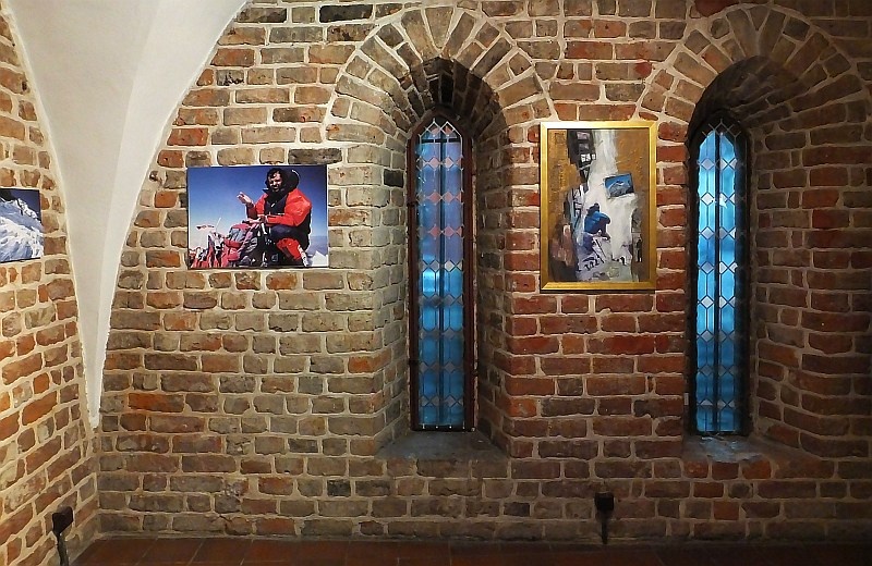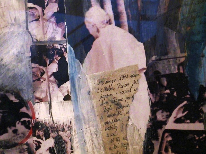 Ewa Dyakowska-Berbeka upodobała sobie technikę kolażu jako środek artystycznego wyrazu. W jej pracach, które mamy okazję zobaczyć na wystawie, dominują dwa nurty: sakralny i inspirowany górskimi wyprawami męża. W szczególny sposób te nurty łączy postać papieża Jana Pawła II. Kiedy Maciej Berbeka wraz z zespołem wytyczali nową drogę na Annapurnę – południową ścianą, miał miejsce zamach na życie papieża. Dzięki technice kolażu artystka umiejętnie przekazała wiele informacji. W zwartej kompozycji obrazu zawarła burzliwą historię zamachu, który wstrząsnął światem i pokazała trud zdobywania przez wspinaczy kolejnych metrów białego, zimnego piekła.