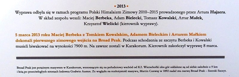 Z ostatniej wyprawy w góry Karakorum, w marcu 2013 r., Maciej Berbeka nie wrócił. Po udanym wejściu na szczyt Broad Peak (8047 m n.p.m.), w drodze powrotnej zespół się rozdzielił. Osłabiony Tomasz Kowalski i Maciej Berbeka zostali na noc na wysokości ok. 7900 m n.p.m.