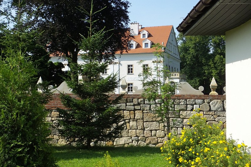 Wybudowany w XVII wieku renesansowy dwór obronny został na następnym wieku przebudowany na pałac. Otoczony był fosą oraz parkiem, z którego pozostały nieliczne skupiska buków, lipy drobnolistnej i jodły. Jak wyglądał pałac można zobaczyć na litografii Aleksandra Duncknera umieszczonej na stronie www.slaskiezamki.pl.