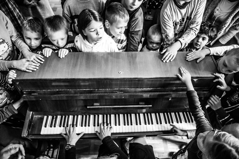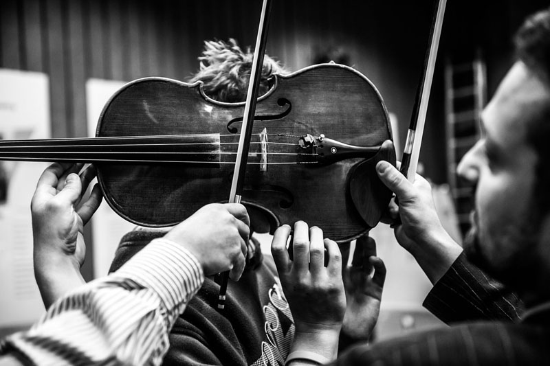 Fotograf przyglądał się i rejestrował w kadrze działania muzyków, muzykologów, specjalistów języka migowego z osobami biorącymi udział w warsztatach. Były to zajęcia z zakresu teorii muzyki, budowy instrumentów, sposobu wydobywania z nich dźwięku, a także ćwiczenia samodzielnej gry na instrumentach. Uczestnicy warsztatów mieli możliwość dotknięcia powierzchni skrzypiec, wiolonczeli, gitary czy saksofonu. Dzięki temu dźwięk przestał być dla nich pojęciem abstrakcyjnym, a stał się zjawiskiem rozpoznawalnym przez inny zmysł – zmysł dotyku. Dodatkowych wrażeń dostarczały drgania powietrza oraz drgania powierzchni samych instrumentów, które wprowadzały osoby niesłyszące w świat muzyki i dźwięków. Efektem warsztatów było wspólne przygotowanie utworu przez grupę uczestników zajęć oraz Orkiestrę Kameralną Polskiego Radia „Amadeus” pod batutą Agnieszki Duczmal, który został wykonany na koncercie finałowym w Auli Uniwersytetu im. Adama Mickiewicza.