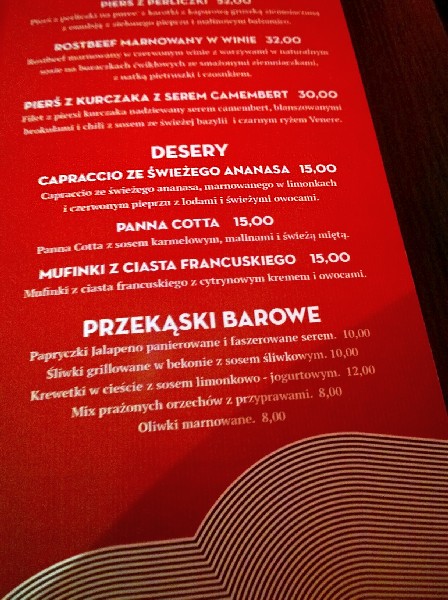 Zajęliśmy stolik z boku sceny. Umościłam się w białym foteliku. Sympatyczna czarnulka zasypała nas stosem wydrukowanych, także w kolorze czerwonym, folderów-menu. Zażartowałam, że wystarczy jedna książeczka, bo reszta jest niepiśmienna… no i trafiłam w dziesiątkę. Nazwy serwowanych potraw brzmiały wymyślnie, aczkolwiek obco. Zatem strona kulinarna wieczoru była dla wszystkich pewną niespodzianką.