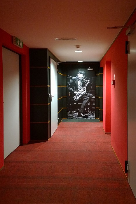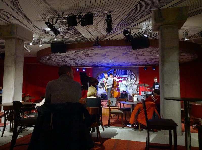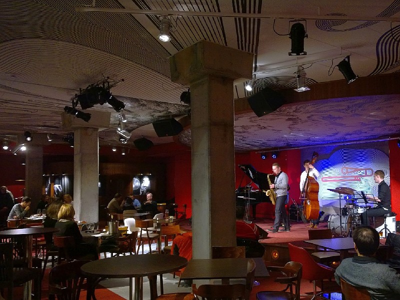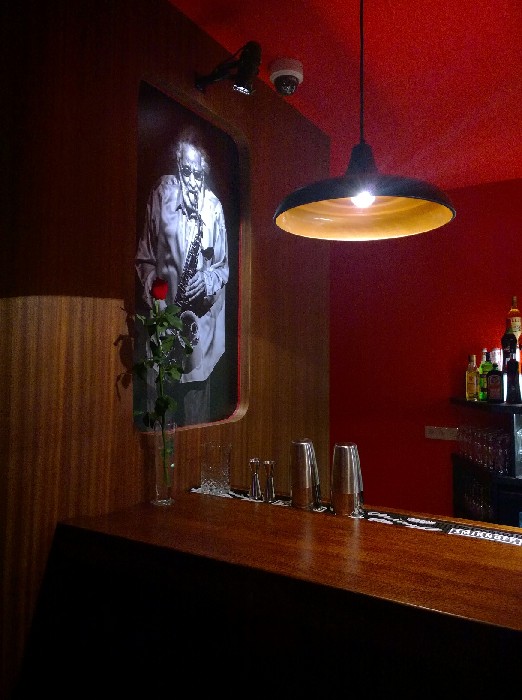 Klub wprawdzie mieści się w podziemiach, ale wnętrze jest całkiem okazałe a sklepienie wysoko nad głowami. Generalnie, w porównaniu z innymi klubami, odczuwa się komfortową przestrzeń, w której nie tylko muzyka ma gdzie pożeglować, ale i klubowi goście. Między stolikami i wzdłuż barowej lady można przechodzić swobodnie. Przemyślane, eleganckie wnętrze sali – z dominującym kolorem głębokiej czerwieni, biało-czarnymi zdjęciami jazzowych muzyków oraz „kosmicznym” sufitem – nieco kłóci się ze zbieraniną krzeseł typową dla dawnych, spartańskich klubów studenckich. Ale i w tej mieszaninie dopatrzyłam się zalety – każdy może dobrać krzesło wygodne dla siebie.