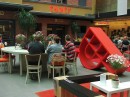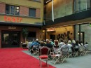 Teatr, wykorzystując niebanalną przestrzeń tuż za drzwiami wejściowymi, przygotował dla gości wygodne pufy, okrągłe stoły, punkt wymiany książek i bufet ze smakołykami. Na tym „podwórku” trwało dzisiaj spotkanie widzów z aktorką Justyną Szafran. Na antresoli, przed „żywą” zieloną ścianą (roślinki zajmują 1300 doniczek!) wszystkie leżaki były zajęte. Chętnych do chwili muzycznego relaksu nie brakowało.