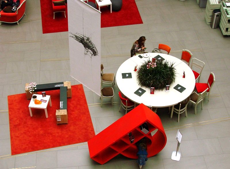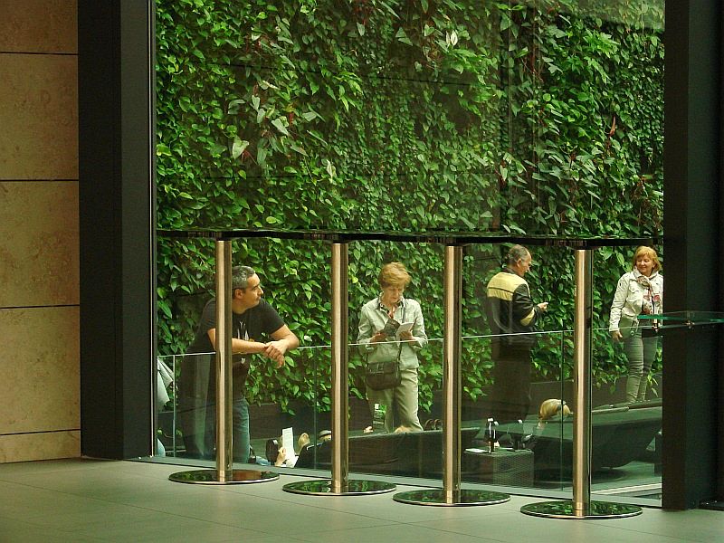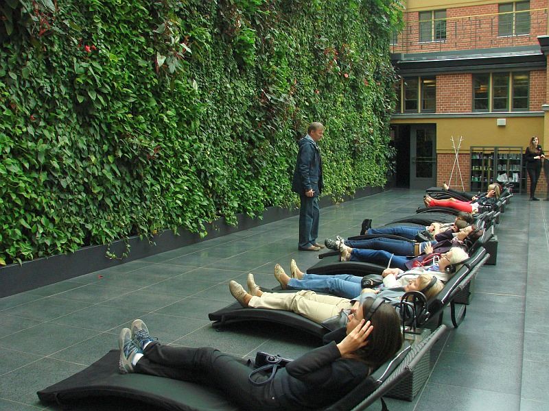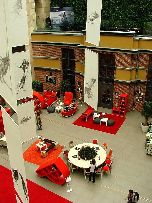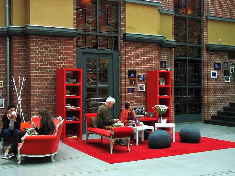 Teatr, wykorzystując niebanalną przestrzeń tuż za drzwiami wejściowymi, przygotował dla gości wygodne pufy, okrągłe stoły, punkt wymiany książek i bufet ze smakołykami. Na tym „podwórku” trwało dzisiaj spotkanie widzów z aktorką Justyną Szafran. Na antresoli, przed „żywą” zieloną ścianą (roślinki zajmują 1300 doniczek!) wszystkie leżaki były zajęte. Chętnych do chwili muzycznego relaksu nie brakowało.