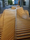 Wnętrze okazało się miłą niespodzianką. Zwarta, w widoku z oddali, bryła gmaszyska została przedzielona pasażem dla pieszych. Surowe mury starają się ocieplić fragmenty elewacji wyłożone listwami i fantazyjna, drewniana ława.
