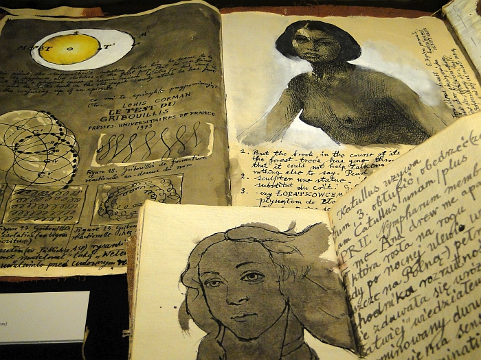 Początkowo oglądałam zamknięte w gablotach eksponaty z przekonaniem, że to autorskie, niepowtarzalne prace samouka o genialnej wyobraźni, twórczej fantazji i zdolnościach plastycznych. Czegoż tam nie było: szkice ołówkiem, portrety, akty, malowane akwarelą krajobrazy, martwa natura, architektura i surrealistyczne kolaże. Elementy nawarstwione w stopniu nie nadającym się do wybiórczej analizy. Łatwiej było patrzeć na całą stronę, chłonąć kolor, fakturę, płynne przejścia od elementów geometrycznych do impresjonistycznych miniaturek, niż próbować zrozumieć, co autor miał na myśli. Jakie prawdy chciał nam, „czytelnikom”, przekazać?