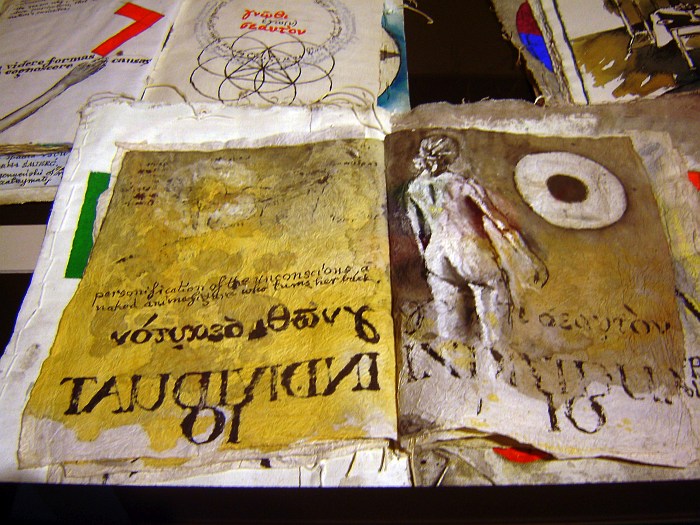 Wiele fragmentów stron pokrywa kaligrafowane pismo. Miejscami są to notatki z zajęć w pracowni malarskiej (komentarz do nauki pod krytycznym okiem profesora) lub spisane dialogi, zasłyszane na przystanku. W innych książkach zdania stanowią niezrozumiały dla mnie zlepek słów w różnych językach. Trudno doszukiwać się znaczeń. I chyba nie ma takiej potrzeby. Cyfry, litery, słowa są równorzędnym elementem plastycznym obrazu, jaki buduje artysta na kolejnych stronach swoich książek, przepełnionych wieloznaczną symboliką.