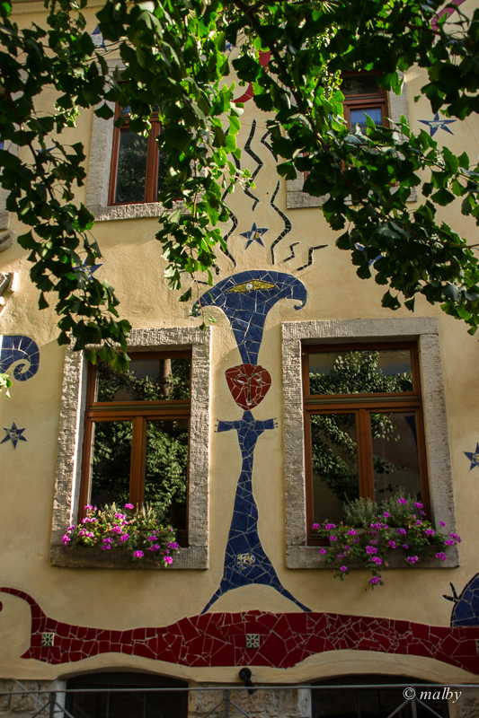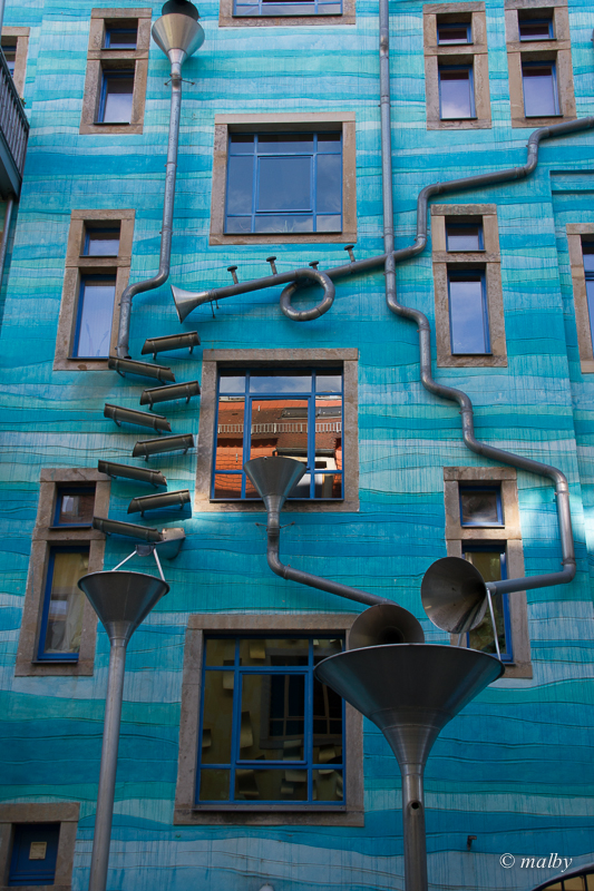 Najbardziej znany jest Grający dom, czyli Dwór Żywiołów (Hof der Elemente). Błękitno-turkusowa fasada, pokryta dziwnie ułożonymi, srebrnymi rynnami, zakończonymi czymś w rodzaju lejków, przyciąga turystów jak magnes. Projektanci – Annette Paul, Christoph Rossner i Andre Tempel – zafascynowani grubymi, poskręcanymi rynnami, jakie zobaczyli w Petersburgu, postanowili przenieść ten pomysł na niemiecki grunt. Szerokie rury, o różnych kształtach pokrywają cały budynek, a kiedy przelatuje przez nie deszczowa woda, wydają dźwięki imitujące muzykę.
