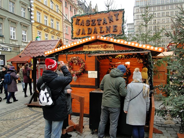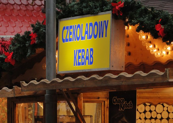 W innym miejscu reklama kulinarnych ciekawostek – czekoladowy kebab i chałwa w płynie. Do pieczonych kasztanów wrocławianie już się przyzwyczaili.