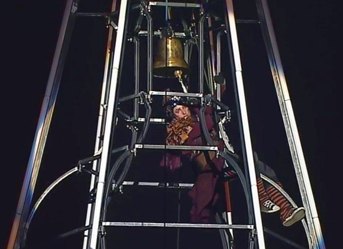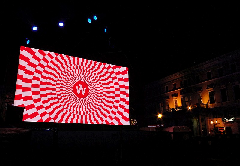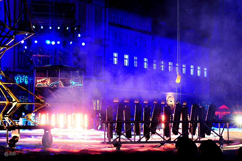 O godzinie 20:15 na szczycie metalowego rusztowania kobieta zawiesiła dzwon a na rynek posypały się białe płatki.