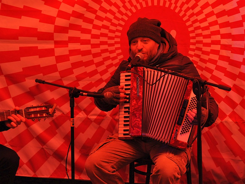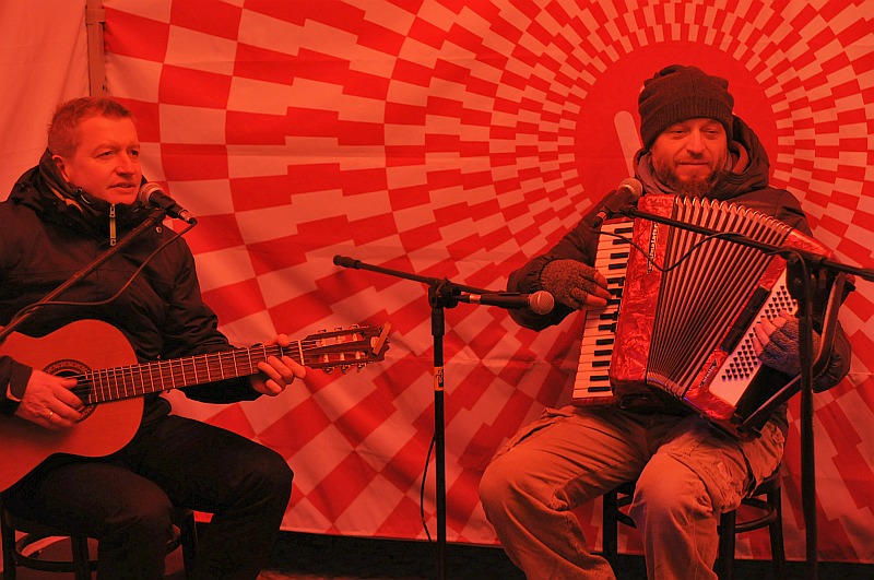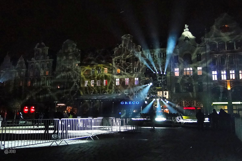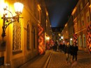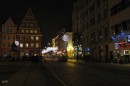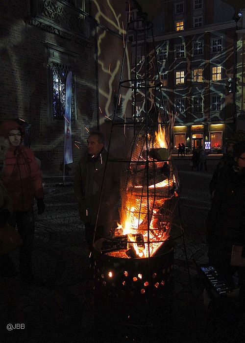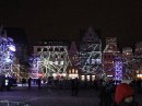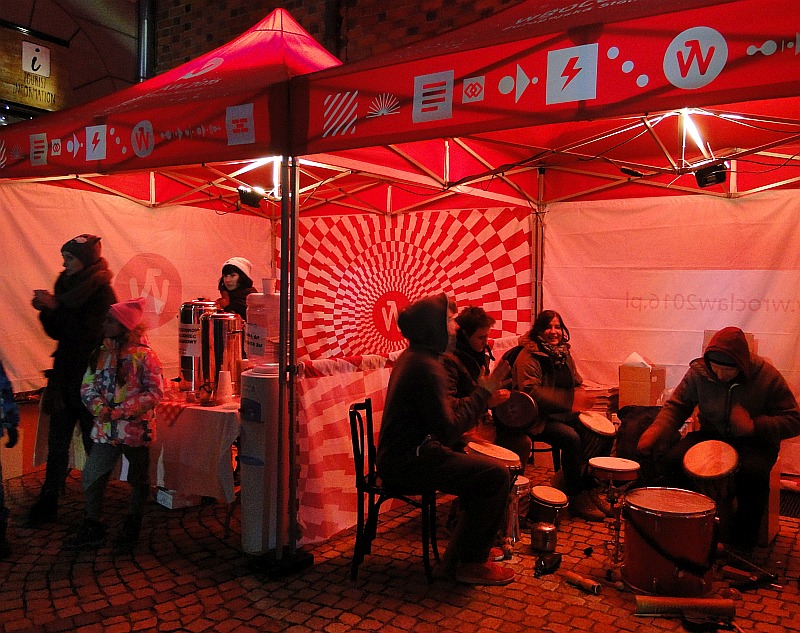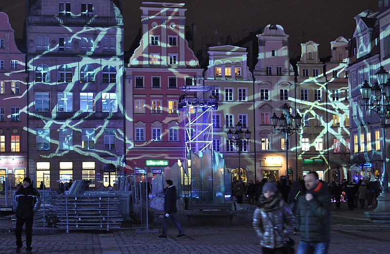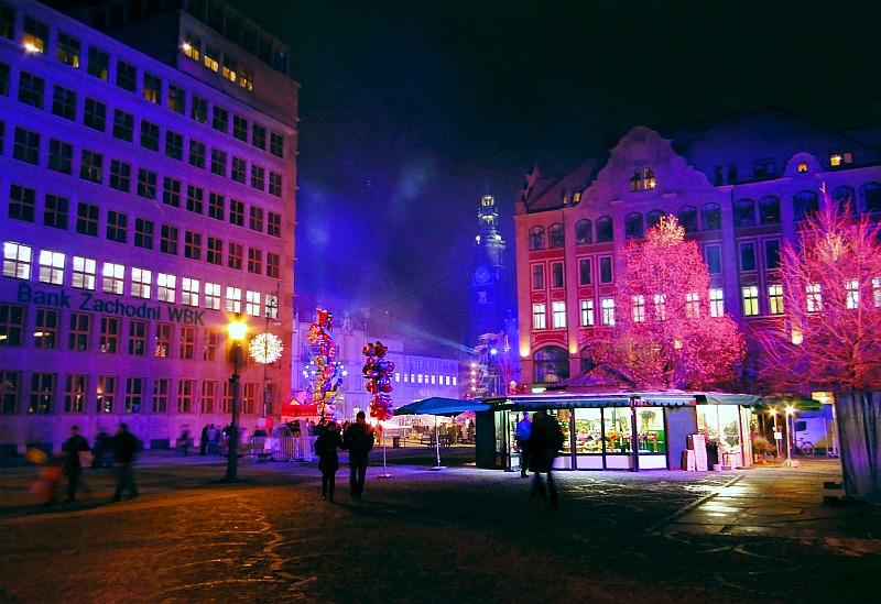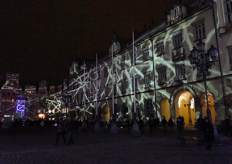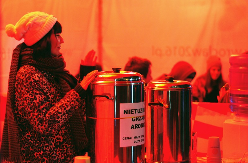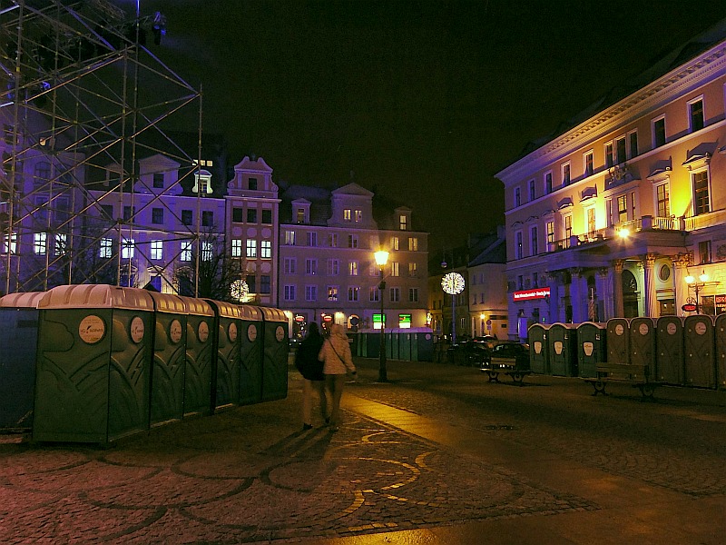 Wędrowałam po zaciemnionym rynku. Tu i ówdzie stały druciane kosze, w których paliły się szczapy drewna. Olbrzymie platformy i ogrodzone rusztowania pod gmachem banku przypominały kosmodrom. Reflektory na wysięgnikach wyświetlały na średniowiecznych kamieniczkach wzory rodem z polowych mundurów. Pod ratuszem i na skraju Placu Solnego w kiermaszowych namiotach udzielali się muzycznie młodzi ludzie. W innych wzrok przyciągały srebrzyste termosy z grzańcem.
