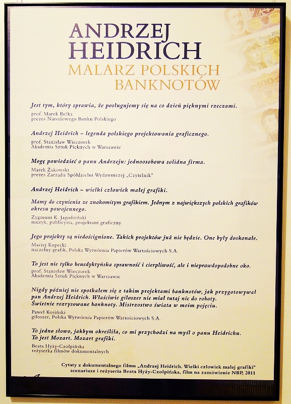„Dzieła sztuki, które nosicie w kieszeni”. Tak, lub podobnie, miał brzmieć tytuł retrospektywnej wystawy prac polskiego artysty Andrzeja Heidricha, autora projektów graficznych wszystkich banknotów, które wydała po reformie pieniężnej Polska Wytwórnia Papierów Wartościowych.