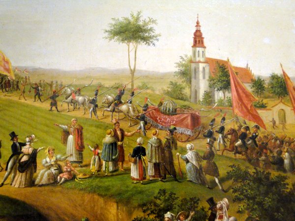 Obraz Teodora Stachowicza – fragment ukazujący wóz z ziemią spod Maciejowic udekorowany koroną z kos