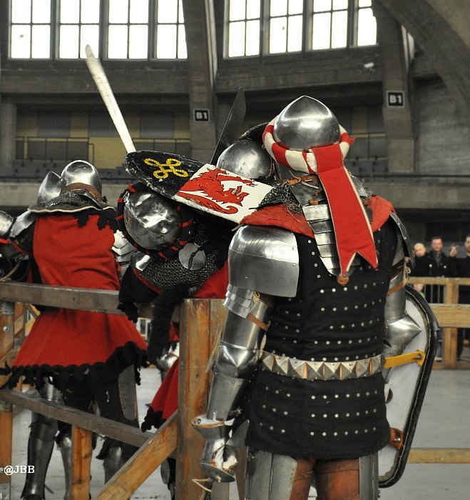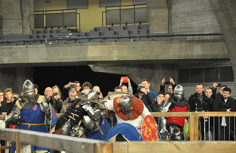 Widzowie tak skutecznie oblepili ogrodzenie „ringu”, że z trudem udało się uchwycić kilka dynamicznych scen walki osobników w ciężkich zbrojach. Zbroje i broń stanowią repliki średniowiecznych. Mają te same wymiary i wagę. Zasady walki opracowano współcześnie. Wprawdzie broń jest tępa, jednak w walce wręcz istnieje duże prawdopodobieństwo urazów. Emocje, wola walki i chęć zwycięstwa, to także czynniki stwarzające groźne sytuacje. Nad bezpieczeństwem rycerzy czuwają sędziowie.