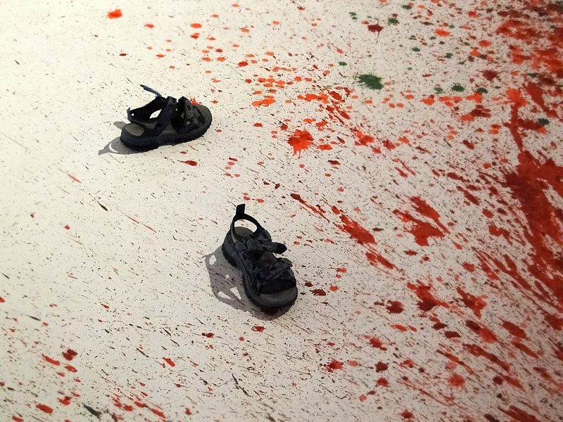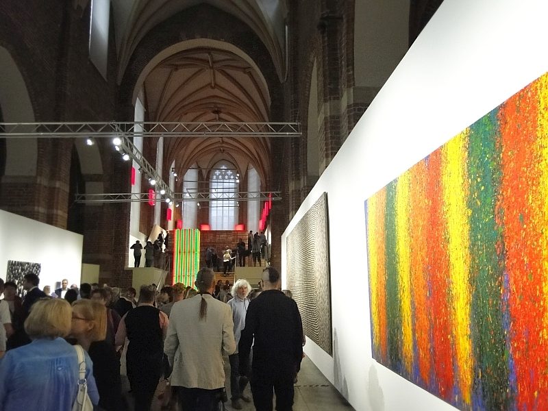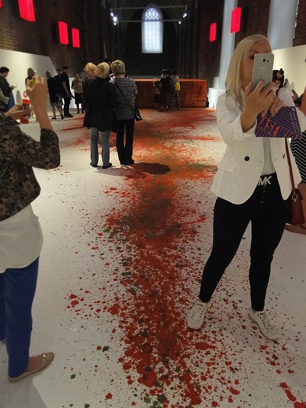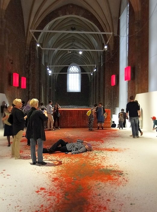 Nawę główną od prezbiterium dzielą schody. W ich obrębie usytuowano instalację malarską, której elementem jest konstrukcja z desek, po których spływa farba, do złudzenia przypominająca krew. Źródeł inspiracji, zdaniem kuratorki wystawy Małgorzaty Devosges-Cuber, należy szukać w historii miejsca niechlubnie naznaczonej postacią Jana Kapistrana, który w 1453 roku przebywał we Wrocławiu i jako „inkwizytor generalny” skazywał Żydów na śmierć przez powieszenie i poćwiartowanie za domniemane akty profanacji .Te krwawe karty historii Wrocławia nie przeszkadzały młodym i starszym widzom na bezpośredni kontakt ze sztuką przez dotyk.
